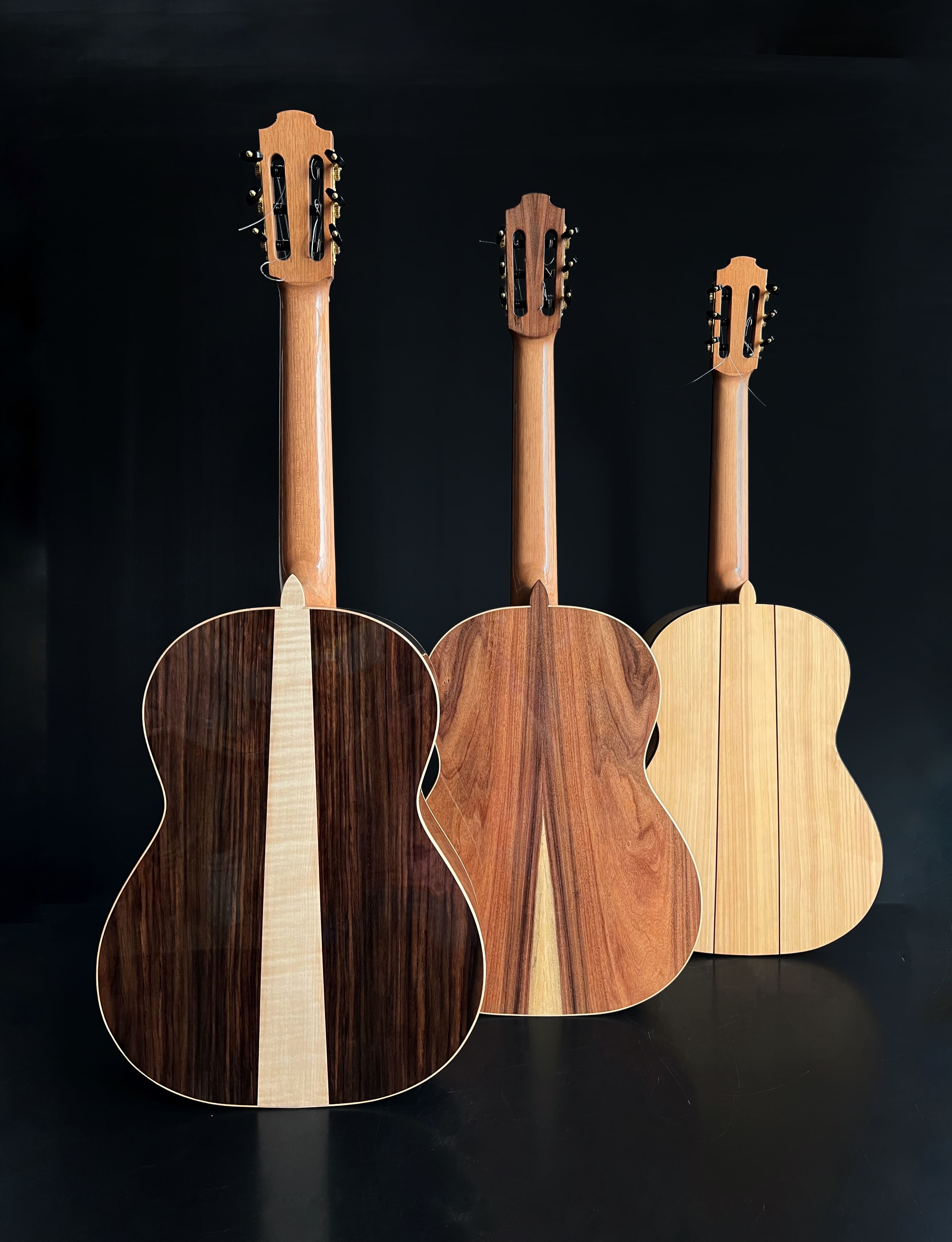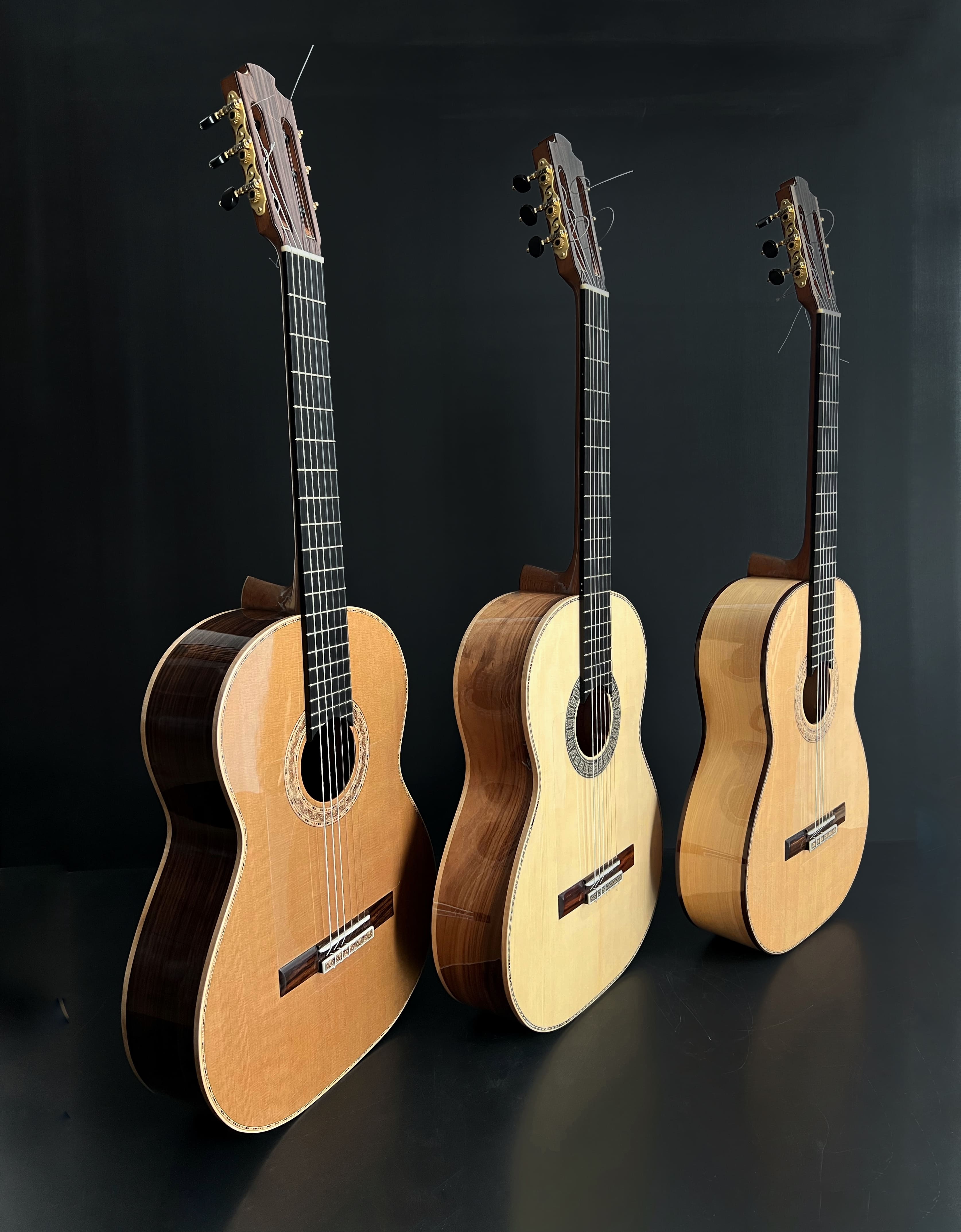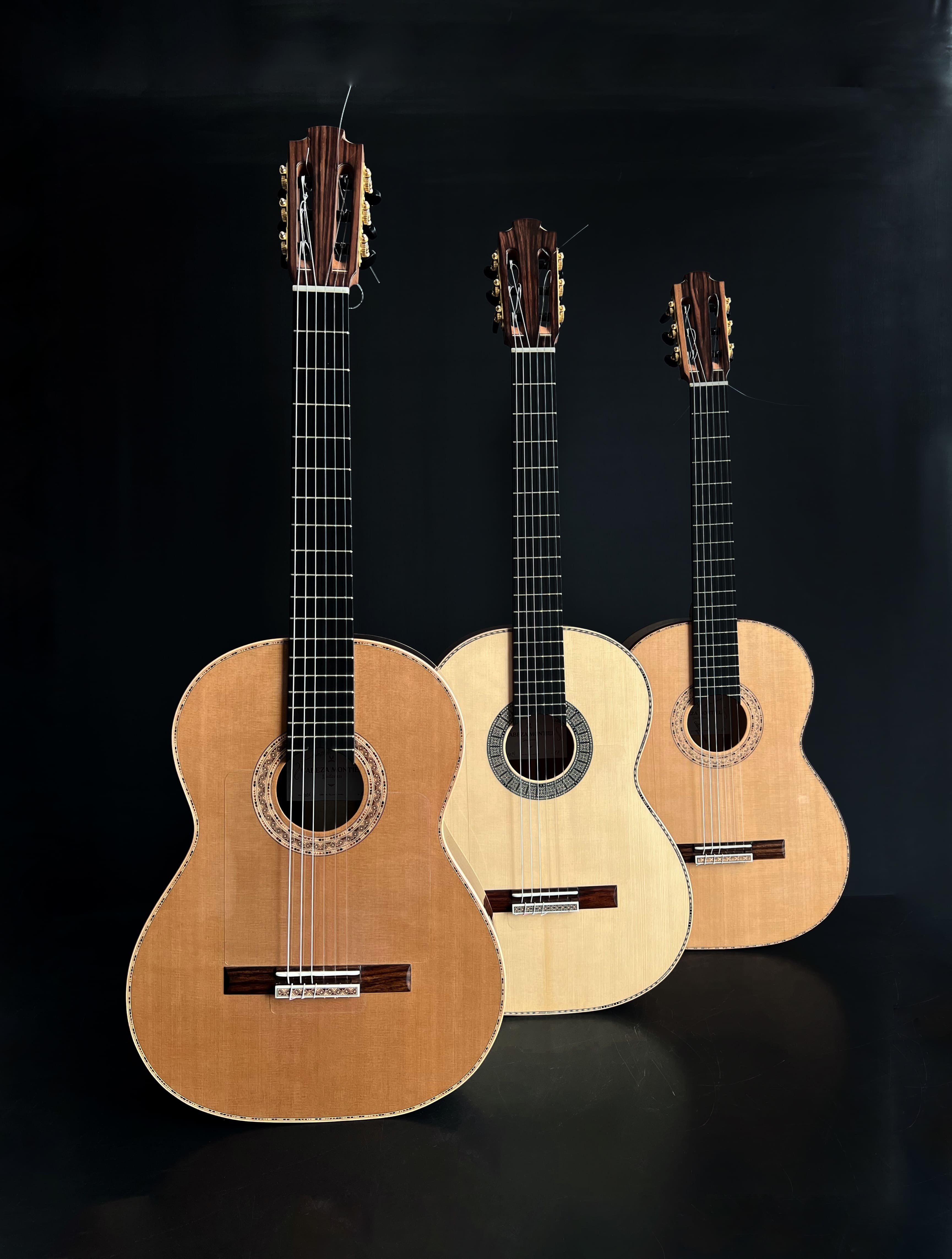 Estas tres guitarras son ejemplo de algunos de nuestros trabajos realizados. La diversidad de opciones que ofrecemos para la personalización del instrumento hace que cada uno sea único. También la gran variedad de madera seca que tenemos disponible en el taller para hacer el instrumento de tus sueños.